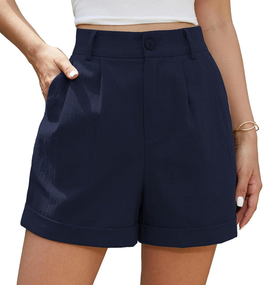 Women's Linen Shorts High Waist Roll Up Pleated Zippered Wide Leg Shorts with Pockets â Navy Blue XXL